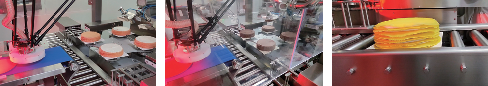 Layer cakes production line Developed using a modular robotic architecture, this production line is specifically designed for the flexible production of 6-12-inch layer cakes. Comprising two flexible robotic pick-up units, a layer cake maker at the front end, and multiple flavor-matching units at the back end, this line automates the entire process from crust production to finished product packaging. The robotic units precisely pick up and stack the crusts, while the back-end creaming machine automatically fills and evenly spreads the cream filling layer. The entire production process requires no human intervention. This innovative production process represents a significant advancement in layer cake production, providing customers with an efficient, hygienic, and high-quality solution.