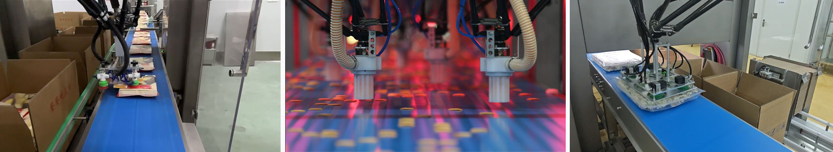 Delta robots are often used in automated food packaging production lines. The IP69 protection design of the robot and its surroundings, as well as the use of titanium alloy and stainless steel DIN1.4404 (316L) design, are very suitable for baked food production lines. They have the characteristics of high rigidity, balanced force, strong load-bearing capacity, small error, high precision, small self-weight load ratio, simple structure, good power performance, fast movement, easy control, quietness and low maintenance. For the tray, box, case or shrink film packaging of various varieties and specifications of baked foods and snack foods, Delta robot sorting shows its powerful flexibility. The robot gripper can adopt vacuum suction cup type, splint type, finger pull-out type and other structural forms to ensure the rapid grasping and movement of various packaging forms.